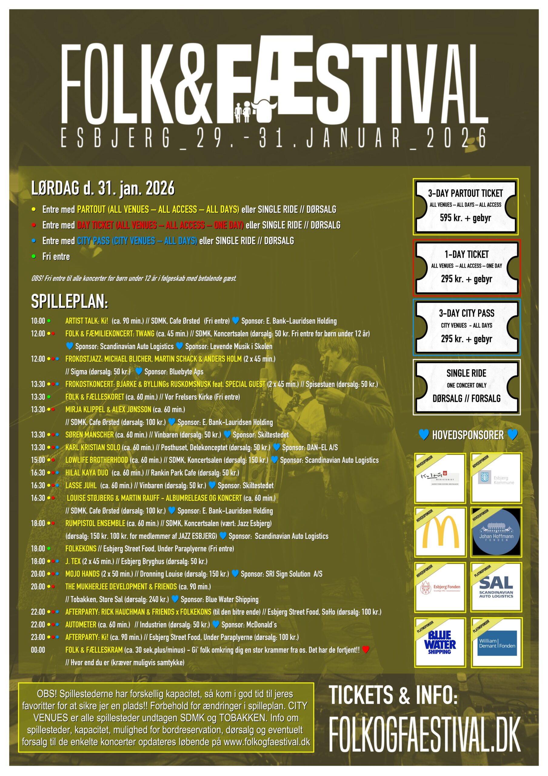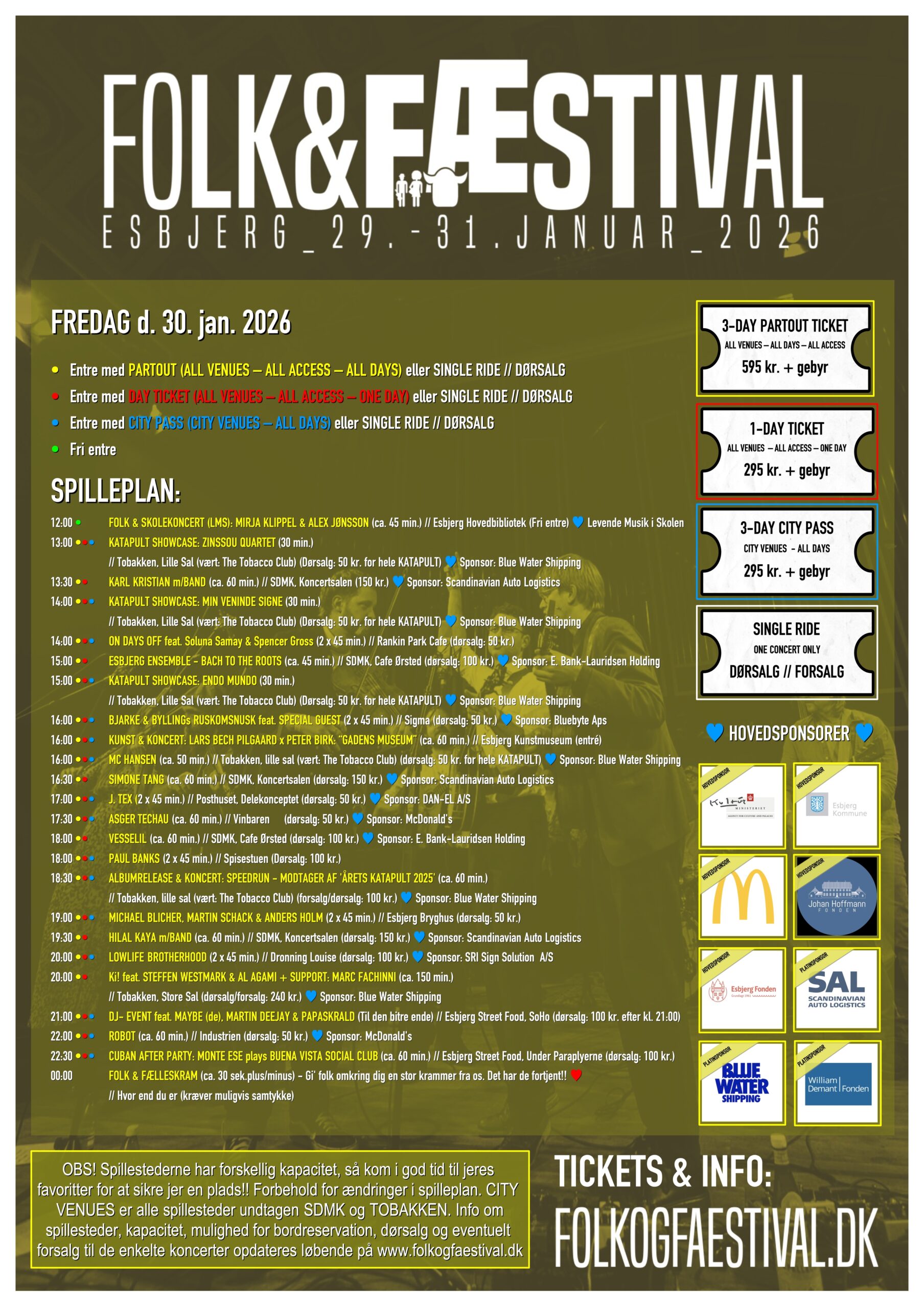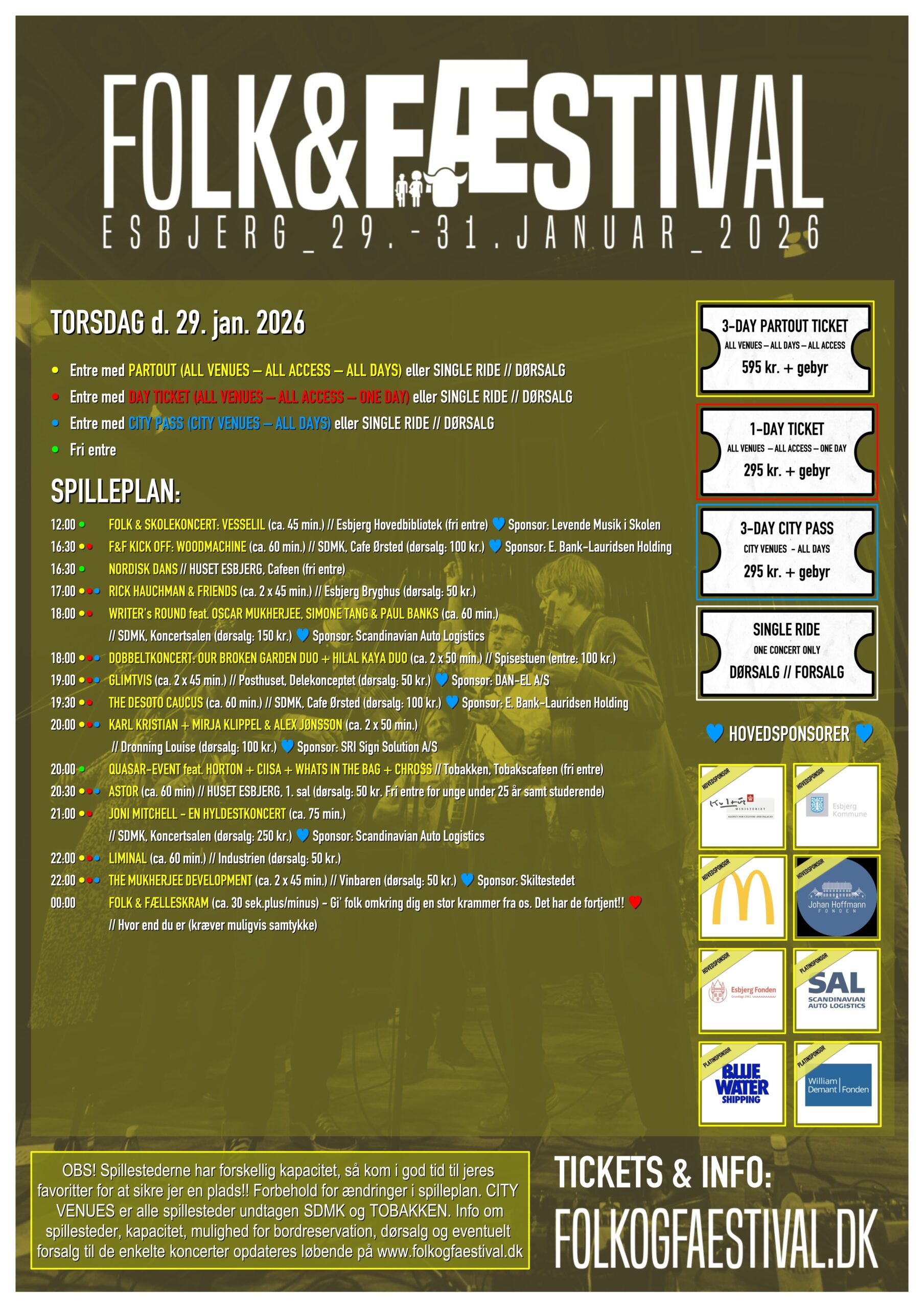 Folk & Fæstival er for dem, der planlægger nøje – og for dem, der lader sig overraske. Med partoutbillet, endagsbillet, city pass eller enkeltkoncerter kan publikum skræddersy deres egen festival. Én koncert eller ti. Ét spillested eller hele byen.