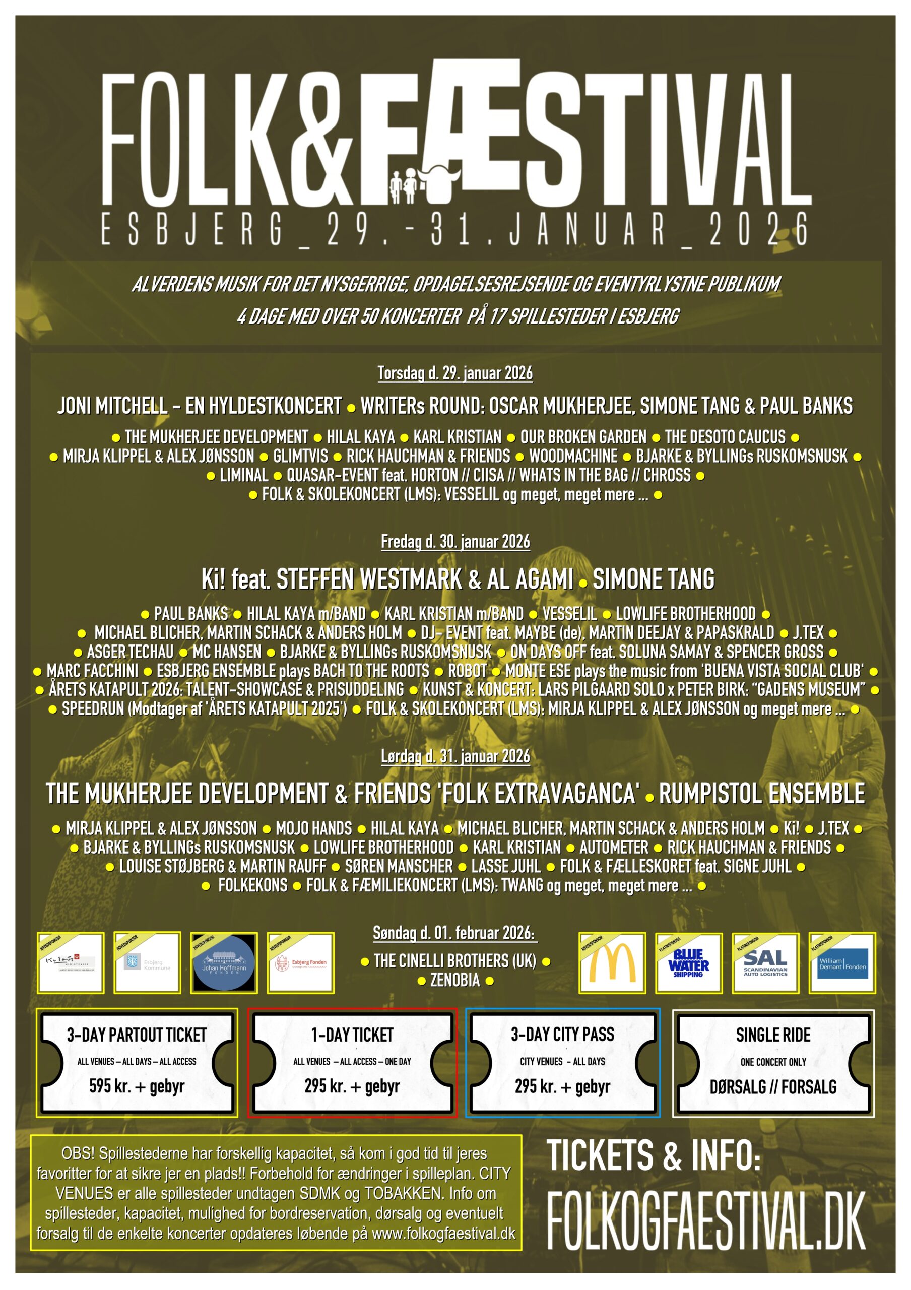 Folk & Fæstival indtager endnu engang Esbjerg med et program, der favner bredt og dybt: folk, roots, jazz, world, singer-songwriter, blues og moderne, genreåbnende udtryk. Store koncertsale og små intime rum. Kendte navne og helt nye stemmer. Og vigtigst af alt: møder – mellem musik og mennesker.