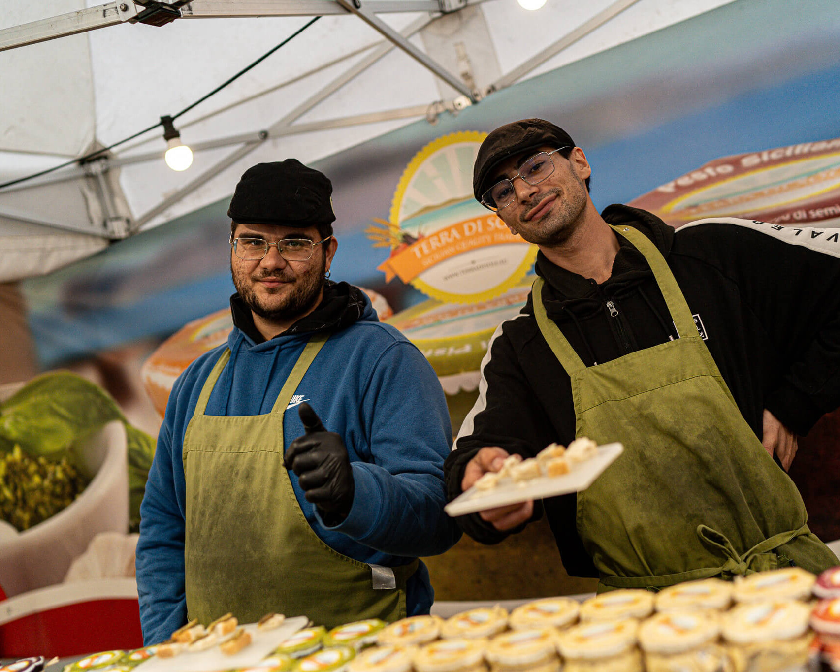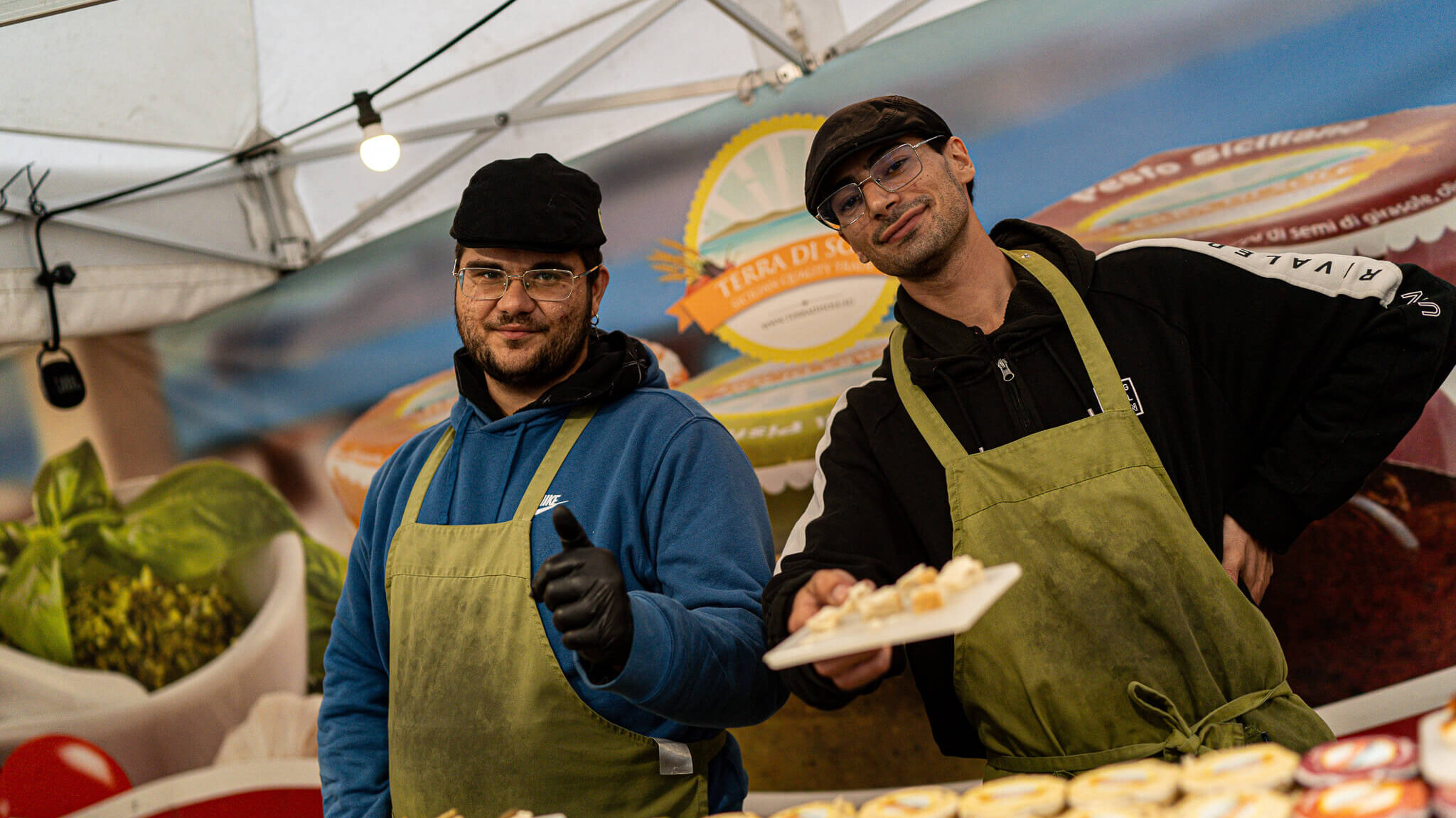 I boden deler de masser af smagsprøver ud på deres mange forskellige slags pesto, flotte soltørrede tomater og extra jomfru olivenolie, der kun produceres i begrænsede mængder.