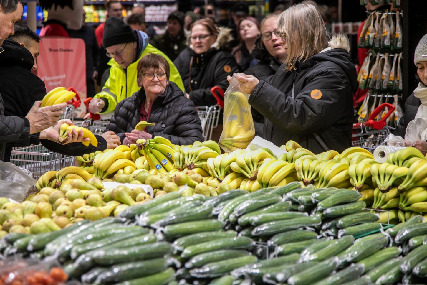 – Nu må jeg så se, hvad butikken kan tilbyde en pensionist, der har fravalgt alle digitale medier – bortset fra fjernsynet. Jeg ved ikke, hvad jeg får lagt i indkøbsposen på min rollator, men noget skal jeg da have med, lød den sidste bemærkning fra Grethe Christensen, inden hun forsvandt ind mellem de store indkøbsvogne og “proppen” med bananer til én krone stykket.