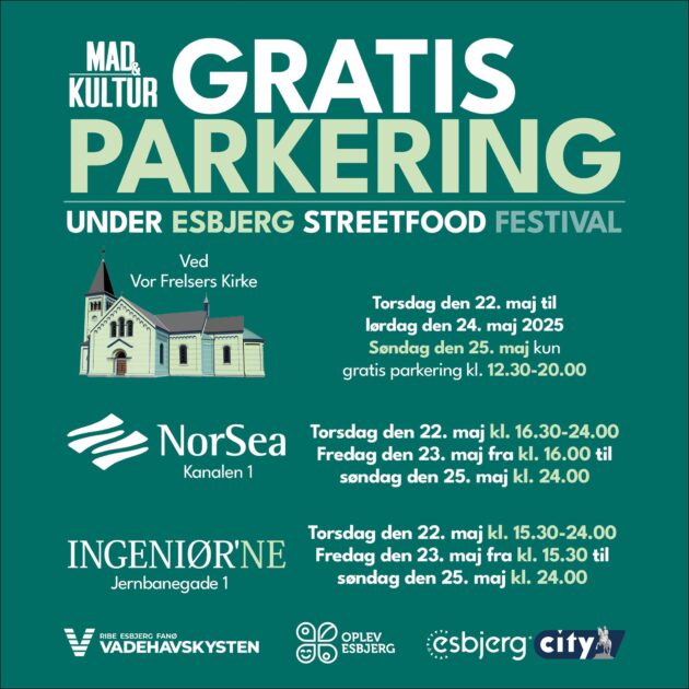 – I et fantastisk samarbejde med Vor Frelsers Kirke, Norsea på Kanalen 1 og Ingeniør’ne i Jernbanegade 1, har du mulighed for at parkere kvit og frit under Esbjerg Streetfood Festival, oplyser Esbjerg City på dagen, hvor Esbjerg Streetfood Festival begynder.