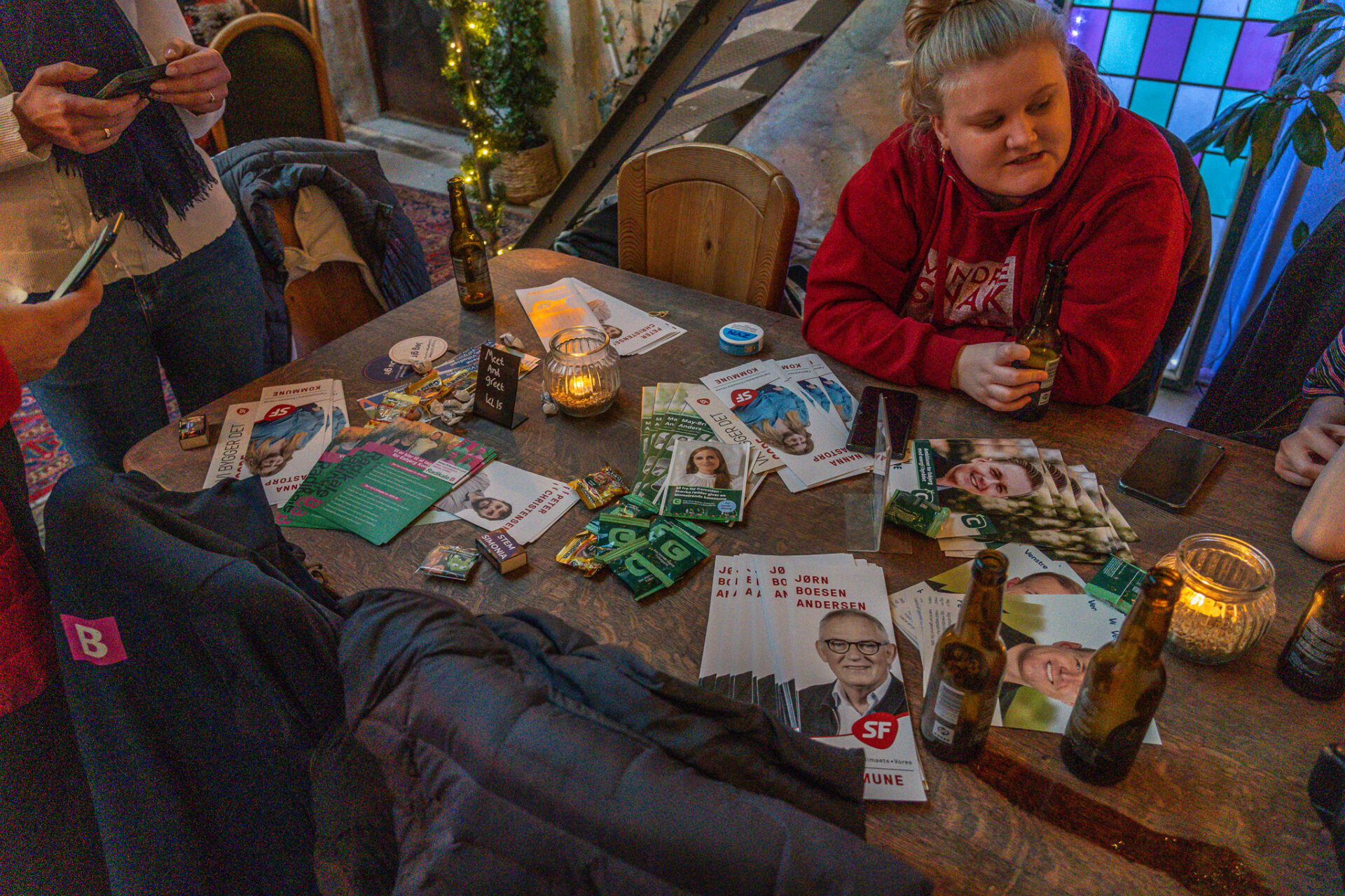I det bagerste lokale stod lokalpolitikere fra stort set alle partier klar med flyers og kaffekop i hånden, mens bryghusets forreste rum summede af snak, skål og smil. Længst nede i lokalet fejrede et polterabendselskab dagens hovedperson, og midt i rummet sad to gæster fordybet i en ølsmagning.
