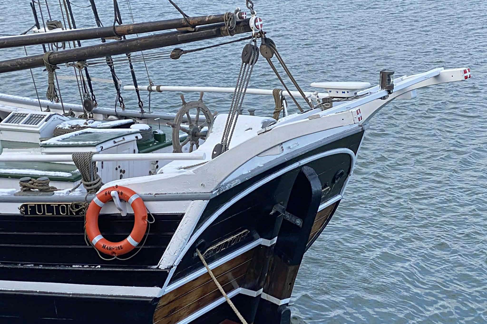 I den koldeste vinterperiode siden 2012 ligger skoleskibet Fulton af Marstal fortøjet i Esbjerg Havn. Den tremastede skonnert fra 1915 er netop ankommet efter værftsophold i Hvide Sande – og selv om sejlene er pakket væk for en stund, er der fuld aktivitet ombord.