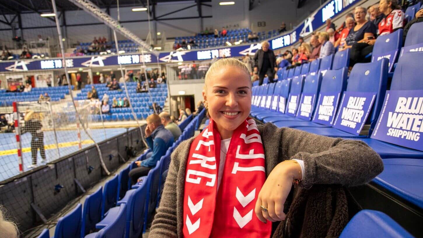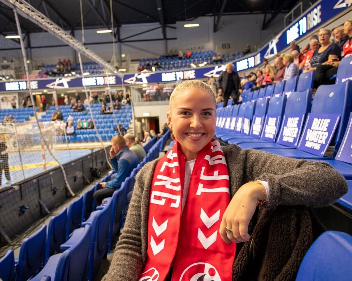 Bag det ene mål sad en kvinde ved siden af to krykker – og det ene ben placeret på en stol. Hun bar et Team Esbjerg tørklæde og så ud til at hygge sig gevaldigt. Ved den første kontakt, lød det på klingende norsk: Hei du!