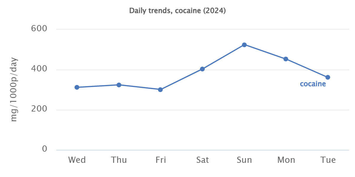 Det mest overraskende ved tallene fra EUDA er, at det langt fra kun er i weekenderne, rusmidlet indtages, om end målingerne dog er højst her. Cirka halvdelen bliver indtaget i løbet af ugen.